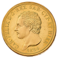 80 Lire 1824 - Zecca: Torino - Diritto: effigie del Re a sinistra - Rovescio: stemma completo di Casa Savoia coronato e circondato dal Collare dell'Annunziata entro due rami di quercia - gr. 25,79 - Non comune - Fondi lucenti, migliore di SPL