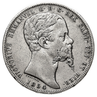 5 Lire 1854 - Zecca: Genova - Diritto: effigie del Re a destra - Rovescio: stemma di Casa Savoia coronato e circondato dal Collare dell'Annunziata - gr. 24,84 - Lucidata, BB