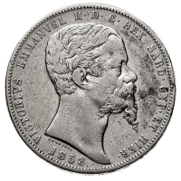 5 Lire 1858 - Zecca: Genova - Diritto: effigie del Re a destra - Rovescio: stemma di Casa Savoia coronato e circondato dal Collare dell'Annunziata - gr. 24,88 - Molto rara - Lievi colpetti al contorno, q.BB