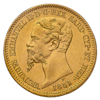 20 Lire 1851 - Zecca: Genova - Diritto: effigie del Re a sinistra - Rovescio: stemma di Casa Savoia coronato e circondato dal Collare dell'Annunziata - Sigillata da Emilio Tevere ("SPL/FDC")
