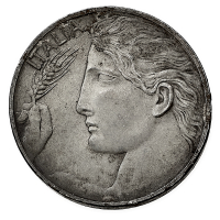 Progetto del 20 Centesimi 1907 - Zecca: Stabilimento Johnson Milano - Diritto: profilo muliebre a sinistra con spiga di grano in mano - Rovescio: la Libertà in volo verso sinistra tiene una fiaccola nella mano sinistra; in basso, a destra, la dicitura PROVA - gr. 3,92 - leggi tutto