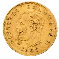 5 Lire 1863 - Zecca: Torino - Diritto: effigie del Re a sinistra - Rovescio: stemma di Casa Savoia coronato e circondato dal Collare dell'Annunziata - gr. 1,59 - SPL