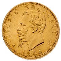 100 Lire 1864 - Zecca: Torino - Diritto: effigie del Re a sinistra - Rovescio: stemma di Casa Savoia coronato e circondato dal Collare dell'Annunziata - gr. 32,23 - Molto rara - Fondi lucenti, migliore di SPL