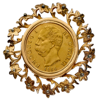 20 Lire 1884 - Zecca: Roma - Diritto: effigie del Re a sinistra - Rovescio: stemma di Casa Savoia coronato e circondato dal Collare dell'Annunziata - gr. 13,37 (peso comprensivo di montatura) - Rara - Esemplare racchiuso in elegante montatura, SPL