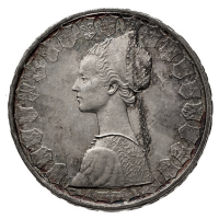 500 Lire Caravelle "Bandiere Rovesciate" 1957 - Zecca: Roma - Diritto: busto muliebre di ispirazione rinascimentale a sinistra - Rovescio: tre caravelle naviganti verso destra con vento in poppa ma con il vessillo dell'albero maestro dispiegato contro vento e con la leggi tutto