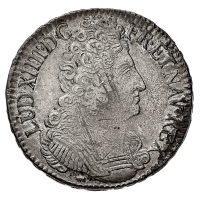Louis XIV (1643-1715) - Ecu "aux insignes" 1702 (?) - Zecca: Troyes - Diritto: busto del Re a destra - Rovescio: tre gigli racchiusi in una cornice coronata - gr. 27,05 - Ribattuta, SPL con patina di antica collezione