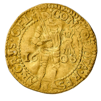 Province Unite (1581-1795) - Ducato 1608 - Zecca: Utrecht - Diritto: guerriero con elmo e corazza di foggia cinquecentesca, stante a destra con spadone e frecce - Rovescio: legenda in cinque righe entro quadrato riccamente ornato - gr. 3,36 - BB