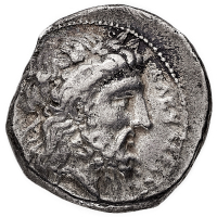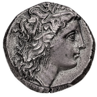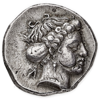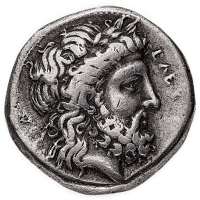 Metaponto - Statere databile al periodo 340-330 a.C. - Diritto: testa di Zeus a destra - Rovescio: spiga di grano disposta verticalmente; sopra la foglia, a sinistra, un sileno accovacciato - gr. 7,72 - Non comune - BB