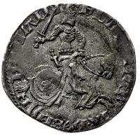Filippo Maria Visconti (1412-1447) - Grosso o Berlinga - Diritto: il Duca a cavallo verso destra brandisce una spada con la mano destra - Rovescio: Sant'Ambrogio seduto di fronte tiene uno staffile con la mano destra e il pastorale con la sinistra - gr. 2,40 - Molto leggi tutto