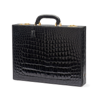 in coccodrillo nero, interno in pelle nera. Manico in coccodrillo, chiusura con doppia serratura a scatto. Completa di clochette e set di chiavi. Hardware in metallo dorato.