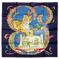in seta multicolore con disegno di una Tigre del Bengala, una scena di caccia ed elementi tropicali su fondo blu.