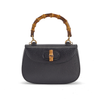 in pelle di cinghiale nera, interno in pelle nera. Manico e chiusura a torsione in bamboo. Tracolla amovibile. Hardware in metallo dorato.