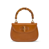 in pelle caramello, interno in pelle beige. Manico e chiusura a torsione in bamboo. Tracolla amovibile in pelle. Hardware in metallo dorato.