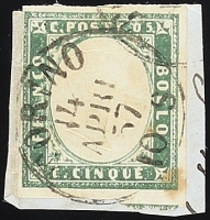 1855 - 5c. verde mirto due esemplari in affrancatura mista con II emissione 40c. rosa su frammento annullati con bollo di Thonon - Da esaminare - Cert. Cardillo