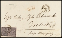1852 - 15 c. rosa I emissione due esemplari su lettera del 31 gennaio 1858 da Piacenza per Intra - Il secondo esemplare con varietà "greca larga" - Firme Bottacchi e Sorani