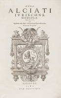 [Giuridica]. Esemplare fresco de In Digestorum, In Codicis Iustinianei e de In Decretalium di Andrea Alciati dell'Opera omnia pubblicata a Lione da Pierre Fradin nel 1560 con 4 tomi in 2 volumi. Ciascun tomo con bella grande marca tipografica al frontespizio, entro leggi tutto
