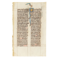 [Manoscritti miniati]. Raro e pregiato insieme di miniature provenienti da 3 diversi manoscritti francesi e fiamminghi, che comprende: 2 fogli pergamenacei (159 x 104 mm), testo in doppia colonna, 2 miniature di uccelli e 6 iniziali miniate in oro, rosso e blu, da un leggi tutto