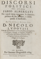 Albergati, Fabio. Discorsi politici del signor Fabio Albergati ne i quali viene riprovata la dottrina politica di Gio. Bodino, e difesa quella di Aristotile. Roma, Giacomo Dragondelli, 1664.