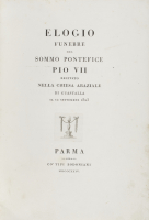[Bodoni - Elogi funebri]. Interessante lotto che contiene elogi funebri, in gran parte stampati da Bodoni. Citiamo tra gli altri un esemplare con barbe dell'Elogio funebre del sommo pontefice Pio VII recitato nella chiesa abaziale di Guastalla il 12 settembre 1823 di leggi tutto