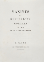 [Bodoni - Francese]. Piccolo lotto dedicato ad edizioni uscite dai torchi di Bodoni e altri stampatori: citiamo Maximes et reflexions morales du duc de la Rochefoucauld del 1812 in legatura bodoniana, un esemplare molto marginoso e con barbe de Le temple de Gnide del leggi tutto