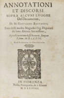 Borghini, Vincenzio Maria. Annotationi et discorsi sopra alcuni luoghi del Decameron. Firenze, Giunta, 1574 (1573).