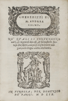Calmo, Andrea. Cherebizzi ... Ne' quali si contengono varij, & ingeniosi discorsi, & fantastiche fantasie filosofiche. Venezia, Domenico Farri, 1559.