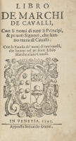 [Cavalli]. Libro de marchi de cavalli, con li nomi di tutti li principi, & privati signori, che hanno razza di cavalli. Venezia, Bernardo Giunta, 1593.