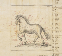 [Cavalli]. Manoscritto anonimo di fine secolo XIX in formato 8° (165 x 110 mm) in inchiostro bruno di 6 carte. Grande incisione di un cavallo ripiegato più volte in fine volume con indicazione di tutte le parti del corpo del cavallo. Legatura del secolo XX in piena leggi tutto