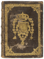 [Legatura]. Legatura del secolo XVIII in pelle colore testa di moro con stemma borbonico ai piatti entro elaborata cornice, fregi e titolo in oro al dorso (227 x 164 mm) che contiene la prima parte del Prodromo delle antichità d'Ercolano alla maestà del re' delle Due leggi tutto