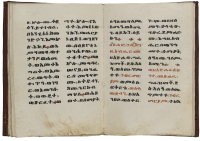 [Manoscritti - Etiopia]. Straordinaria coppia di manoscritti religiosi in Ge'ez, la lingua liturgica della Chiesa ortodossa d'Etiopia, risalenti probabilmente al XIX o XX secolo, entrambi realizzati con la tipica pergamena (beranna), trascritti su 2 colonne in nero e leggi tutto