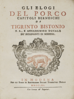 [Gastronomia - Porchetta]. Ferrari, Giuseppe. Gli elogi del porco capitoli berneschi di Tigrinto Bistonio p.a., e accademico ducale de' Dissonanti. Modena, Bartolomeo Soliani, 1761.