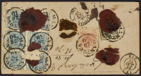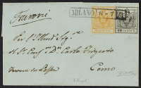 1856 - 45 c. azzurro III tipo carta a macchina blocco di sei esemplari+ 10 c. nero I emissione carta a mano + 15 c. rosso vermiglio III tipo carta a macchina su lettera raccomandata del 20 ottobre da Mantova per Carcassonne (Francia) - Da esaminare - Cert. Cardillo