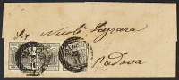 1850/51 - 15 c. rosso vermiglio I tipo coppia orizzontale + carta a mano 15 c. rosso vermiglio I tipo coppia orizzontale su lettera del 13 settembre da Cadore per Venezia - Rara - Ex collezione Capellaro - Cert. Bolaffi e Diena