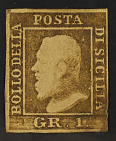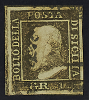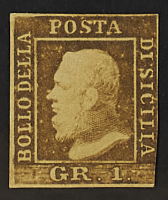 1859 - 1 gr. I tavola II stato verde oliva grigiastro - Tra le più rare gradazioni cromatiche dell'emissione di Sicilia - Da esaminare - Cert. Raybaudi