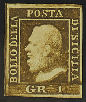 1859 - 1 gr. I tavola II stato bruno olivastro - Unito altro esemplare nella gradazione cromatica bruno oliva grigiastro - Da esaminare - Cert. Raybaudi - Firma E. Diena