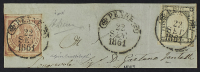 Insieme di frammenti e documenti postali affrancati con esemplari del Regno di Napoli e delle Province Napoletane in diverse combinazioni miste - Da esaminare ma di grande rarità - Cinque certificati