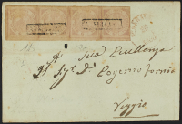 1858 - 1/2 gr. I tavola rosa chiaro striscia orizzontale di quattro esemplari su lettera dell'aprile 1860 da Gerace per Reggio - Cert. Diena