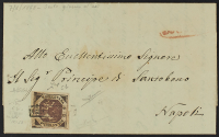 1858 - 2 gr. I tavola lilla rosa su lettera del 15 gennaio (primo mese d'uso) da Reggio per Napoli - Documento fresco e ben conservato - Cert. Raybaudi