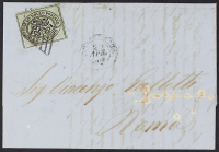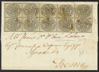 1852 - 1/2 baj. grigio blocco orizzontale di dieci esemplari su lettera del 13 agosto 1858 da Fossombrone per Roma - Un esemplare a filo ma cinque esemplari "otto filetti" - Estremamente rara - Ex collezione Giulio Andreotti - Cert. Colla e Diena