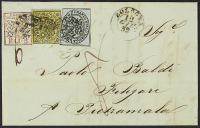 1852 - 1/2 baj. grigio azzurro + 2 baj. verde oliva + 5 baj. rosa chiaro in affrancatura "tricolore" su lettera del 12 giugno da Bologna per Foligno