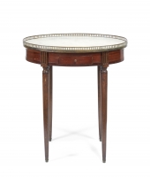 In noce, con piano in marmo grigio e ringhiera traforata in ottone, a due cassetti e due piani a scorrimento laterali, con gambe a colonna rastremata scanalata.