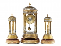 Composto da un orologio e due elementi decorativi a padiglione, in metallo dorato e smalti champlevé a motivi floreali policromi, i due padiglioni centrati da sfingi in metallo dorato. Il quadrante in metallo dorato con numerazione araba entro indici circolari e