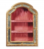 Sagomata, con cornici in legno dorato ed ampio bordo a specchi interrotti da fermagli floreali in legno dorato, a tre ripiani foderati in seta rossa.