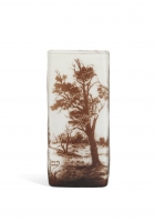 In vetro lattescente e marrone inciso all'acido a cammeo, un decoro a paesaggio invernale.