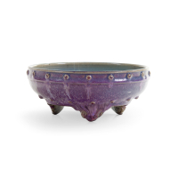 Porcellana con invetriatura viola flambé di tipo Jun, sostenuto da tre piedi a mensola e bugnatura lungo l'esterno della bocca.