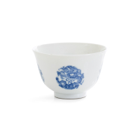 Porcellana dipinta in blu di cobalto sotto coperta, l'esterno della parete con draghi, marchio apocrifo di Kangxi al centro della base.