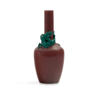Porcellana con invetriatura rossa, tra spalla e collo drago a rilievo in verde, marchio apocrifo di Kangxi al centro della base.