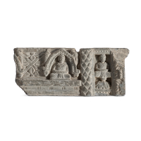 Scisto grigio, raffigurante due figure di Buddha seduto tra elementi architettonici e motivi geometrici.