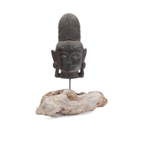 Scisto grigio, la scena in accentuato rilievo raffigura il Buddha seduto su plinto e affiancato da alcuni fedeli, ai lati colonne.