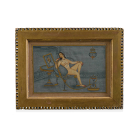 Inchiostro e colori su carta, raffigurante una donna nuda seduta su una poltrona in posa lasciva, mentre fuma il narghilè e guarda un’immagine del suo amato. Entro cornice in legno dorato.